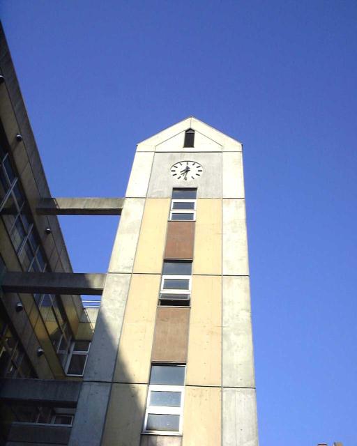 正門からそのまま直進し、右を見上げると時計塔が見えます。